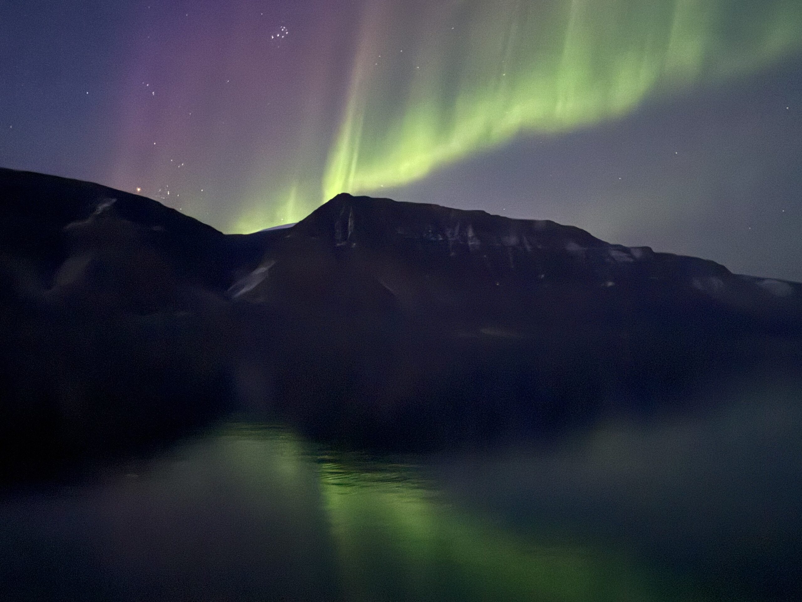 Als we naar het zuiden varen, is de kans groot dat we walvissen zien in de omringende zee, en als de avond weer valt, hebben we een goede kans om het Noorderlicht te zien in de lucht erboven.
